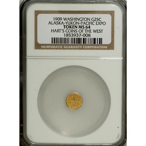 <B>1909 Alaska-Yukon-Pacific Exposition MS64 NGC.</B></I> HK-360. 1/4 DWT. These 1909 pieces from M.E. Hart are among the most widely seen and recognized of all the various pieces by that issuer. This piece is a stunning near-Gem example with rich orange-gold luster and full design details on both sides. These tokens are almost never seen as sharply detailed as this one.<BR><BR><b>Shipping:</b> Coins & Currency (<a target="_blank" href="http://www.heritageauctions.com/common/shipping.php">view shipping information</a>)