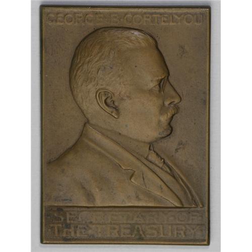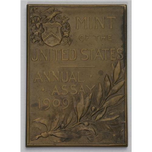 <B>1909 Assay Commission Medal. MS60 Uncertified.</B></I> Julian AC-53, R.3. Bronze, 56.1 x 39.4 mm., 740.8 grains. This was the final plaque issued for the Assay Commission. Beginning in 1910 and continuing through 1975, all Assay medals reverted to the familiar round shape. The obverse has a bust of George B. Cortelyou, facing right, with SECRETARY OF THE TREASURY below. The reverse is the same design used earlier in 1905, except for the changed date. Attractive yellow-bronze with a decided olive tint and splashes of darker toning. This is a sharply struck example, unlike the 1960s-era restrikes that were more softly detailed.