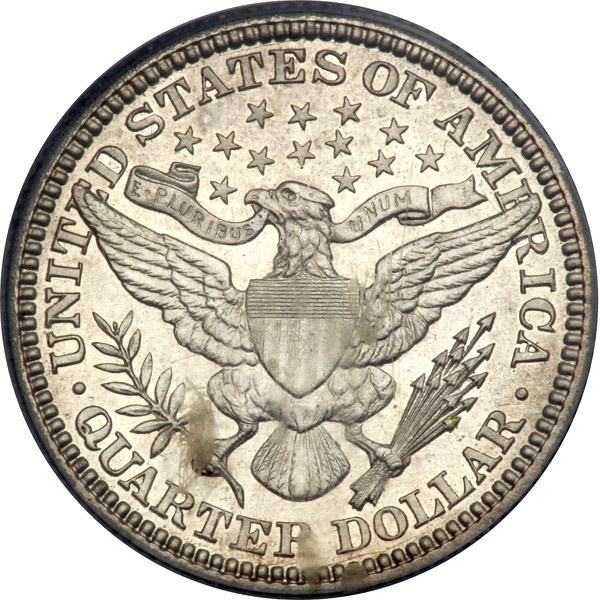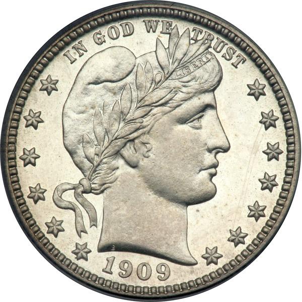 1909 Barber Quarter Dollar. PCGS graded Proof 64 Cameo. A wonderful brilliant white coin. Only 650 Proofs struck. This is the right one to choose for a choice to gem quality U.S. Type collection. Pop 9; 22 finer (PCGS # 85695) .