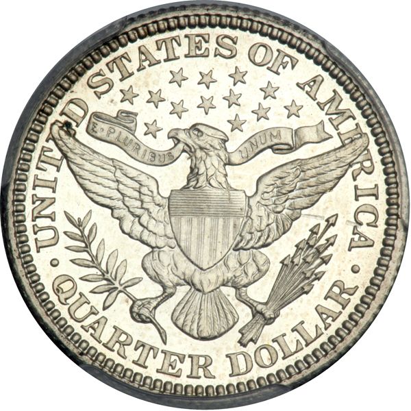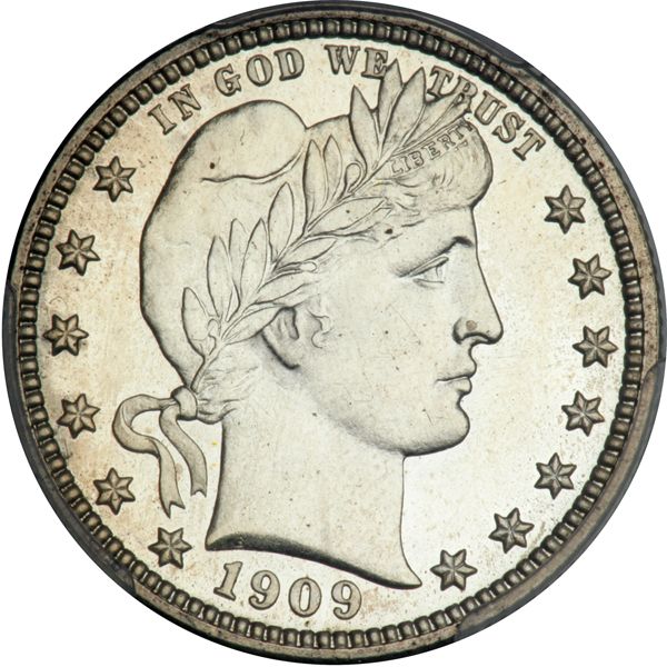 1909 Barber Quarter Dollar. PCGS graded Proof 64 Cameo. Only 650 struck. A nice white coin. Bold cameo Proof with strong underlying luster. Nicely struck, as are all in this remarkable Registry group, still, mention is merited. Indeed, the strike of the present coin easily rivals that of higher grade specimens one finds in the marketplace from time to time. Pop 8; 25 finer (PCGS # 85695) .