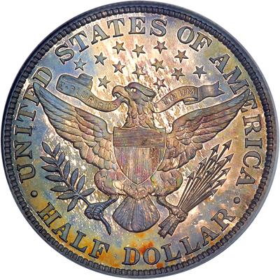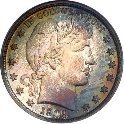 1909 Barber Half Dollar. PCGS graded Proof 68 Cameo. Lovely shades of rainbow toning. Only 650 Proofs issued. This is a defining Proof 68 coin, stunning from both a technical as well as visual perspective. A swath of brilliance intersects the central obverse with warm deeply tinted iridescence at the sides. The reverse is similarly patinated in very becoming shades, and both sides are free of handling marks. There is a extensive frost on the Liberty and the eagle, while the fields display typical reflective finish with particularly vibrant mirrors in fact. Type collectors who want only the best will be your competition when it's Lot number comes up for bidding. Take full advantage of the occasion that this coin presents. Pop 1; the finest example graded at PCGS (PCGS # 86556) .