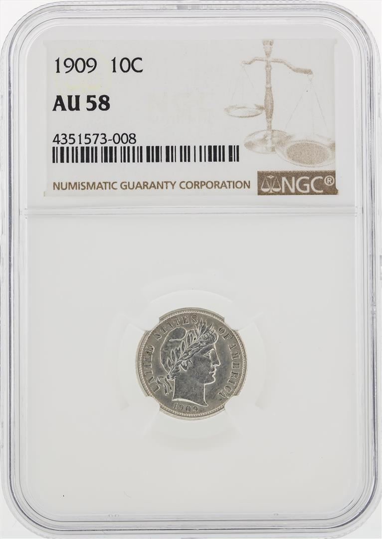One 1909 Barber Dime Coin NGC AU58. NGC Certified.