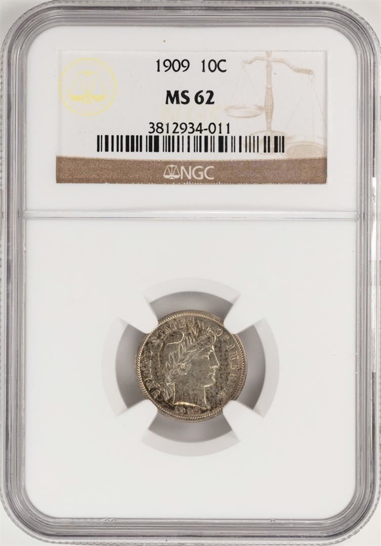 One 1909 Barber Dime Coin NGC MS62. NGC Certified.