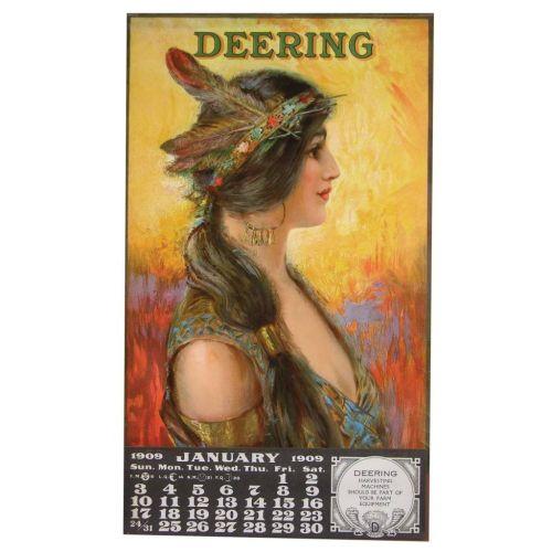 1909 Calendar for Deering Harvesting Machines. Depicting beautiful Native American Indian maiden. Original band on top, full pad. In period oak frame. Some minor paper loss at 11:00 otherwise excellent condition. 13 1/2 X 22 1/2 inches.