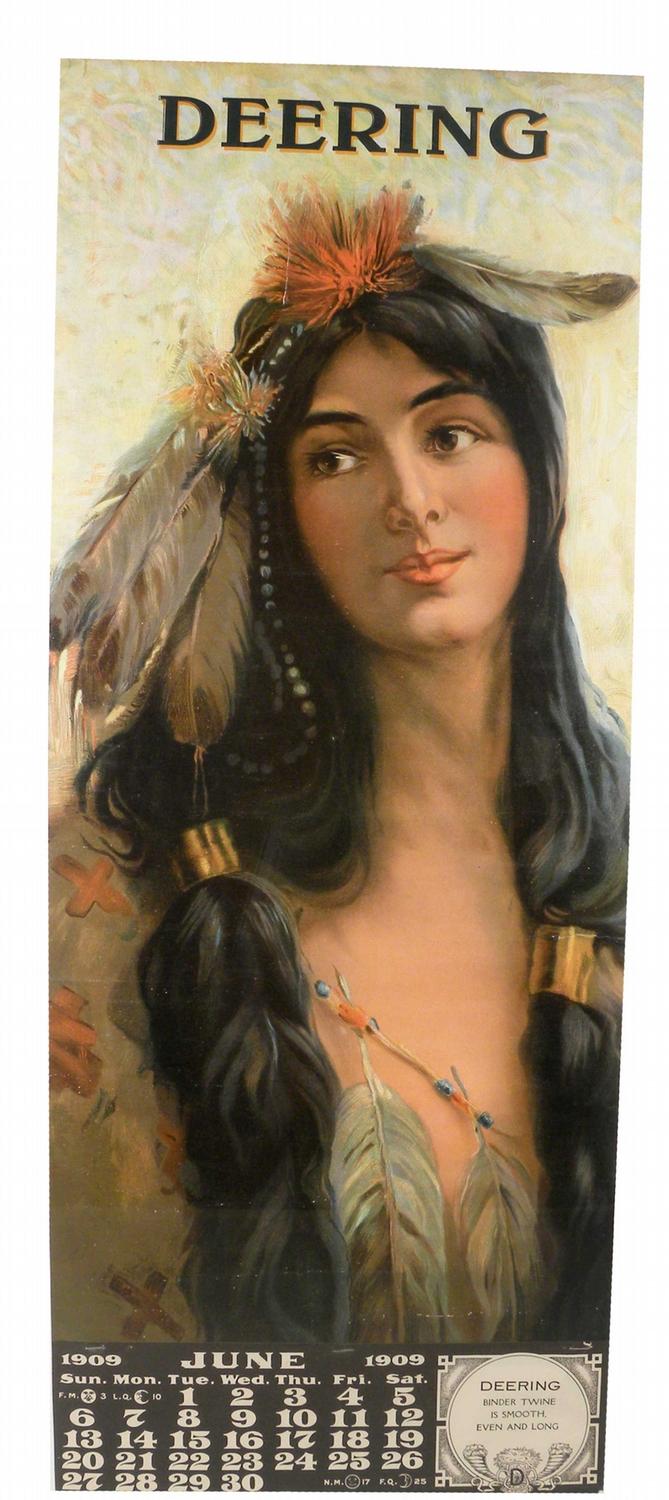 1909 Calendar for Deering Binder Twine, Indian Maiden. June page only, no bands. A couple of horizontal creases, tiny paper loss on calendar page otherwise very good condition. 13 X 32 inches. Start Price $150