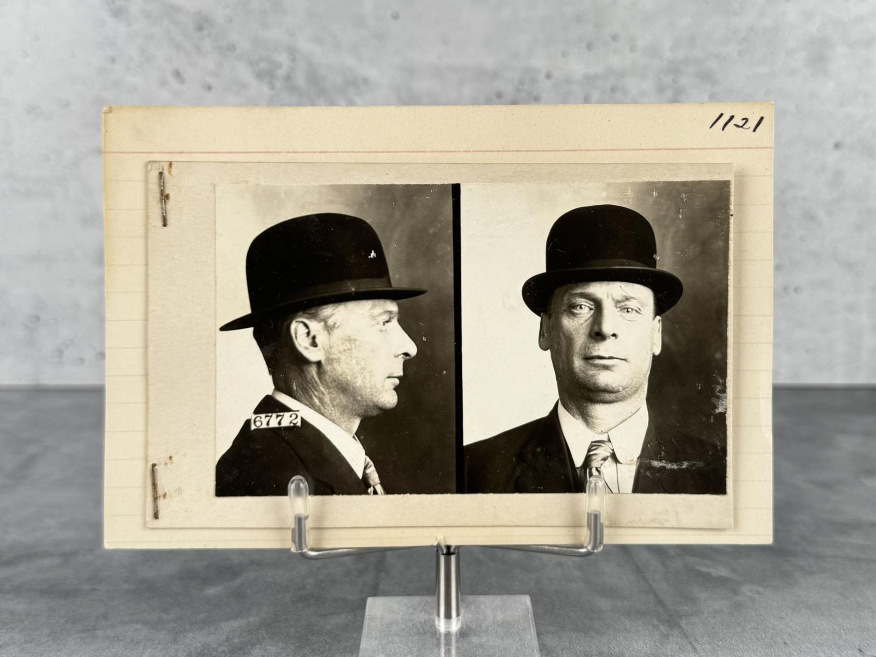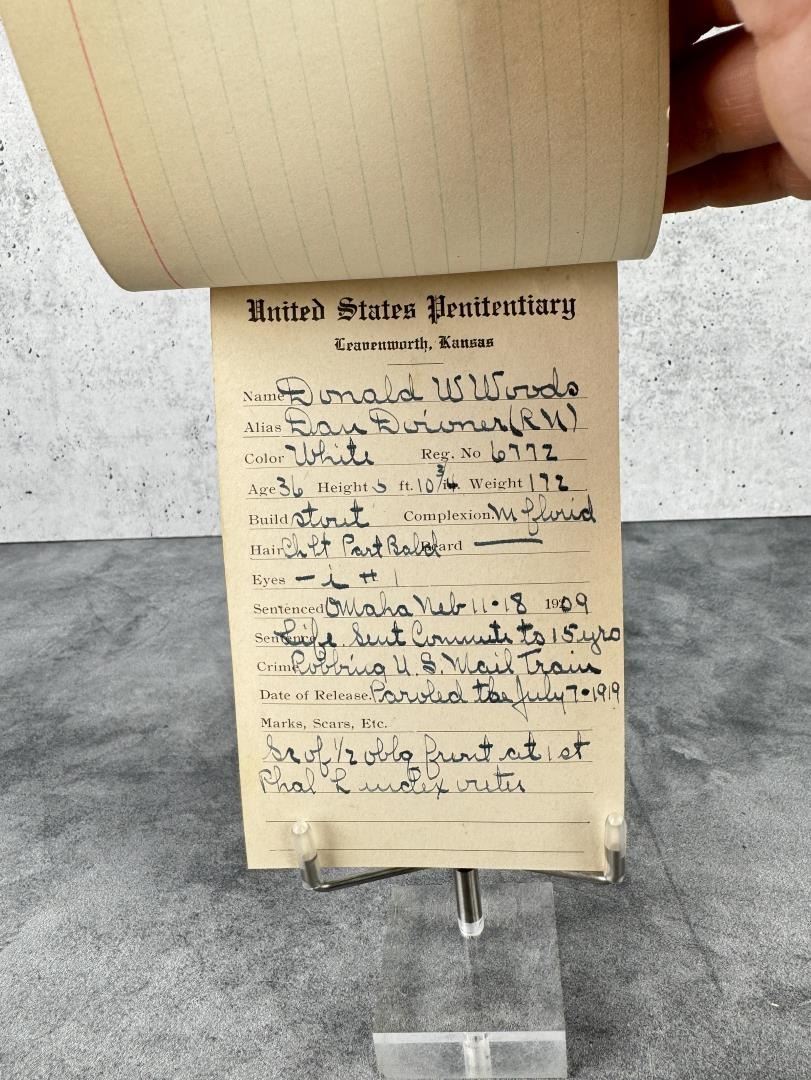 Measures 6" by 4". Front and side mug shots as well as data card for convicted train robber Donald W Woods.