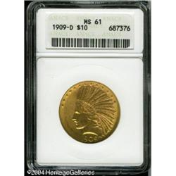 1909-D $10 MS61 ANACS. Typically struck with excee <B>1909-D $10 MS61 ANACS.</B></I> Typically struck with exceedingly bright, matte-like surfaces, beautiful pink and green-gold colors, a mark-free obverse, and a few small field abrasions on the reverse. <BR><BR><B>Important notice:</B> Heritage usually auctions material at the rate of 200-250 lots per hour. On some occasions eBay Live bid software or the Internet may not be able to keep up with the pace of the auction. We recommend placing a realistic absentee bid now as insurance to avoid disappointment. Occasionally the auctioneer may eliminate or reject an eBay Live bid, and the auctioneer may also reopen a lot after the close of the eBay live bidding (usually because we missed an audience bid), and may reject your bid even if it shows you as the winning bidder. By bidding via eBay Live, you agree that Heritage may award the lot to another bidder at its sole discretion under the circumstances described above or any other reasonable circumstances. Since eBay bids are not shown to us until we open the lot on the floor, we treat those bids just like floor bids. In most cases the floor responds before the eBay bid is presented to us, due to Internet lag time, so for consistency we have made it a policy that floor bids are always considered first over tie eBay live bids. Also please note that all Heritage lots purchased through eBay Live carry a 20% Buyer's Premium. Please make sure you read the Terms and Conditions before you bid. This lot is being auctioned in conjunction with a live floor auction by Heritage Galleries & Auctioneers. All final auction and invoice information will be supplied by Heritage Galleries & Auctioneers, and all other information should be considered preliminary. Lot:6802