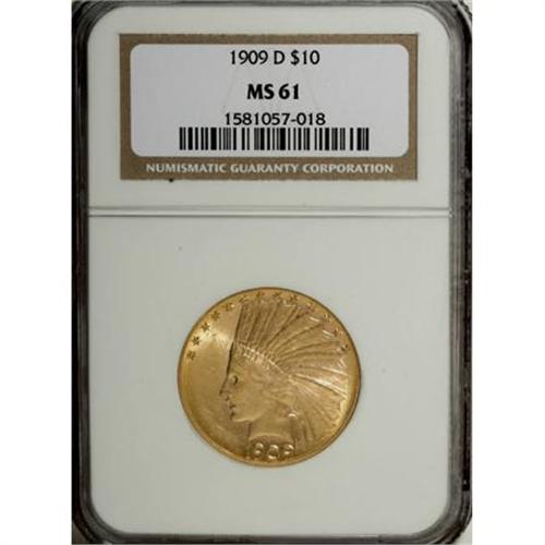 <B>1909-D $10 MS61 NGC.</B></I> Vibrant luster graces the straw-gold and sun-gold surfaces of this earlier With Motto Saint-Gaudens eagle. Well struck with myriad shallow abrasions that account for the grade.<BR><I>From The Diemer L. Fife Collection.</B></I><BR><BR><B>Coin Engraver:</B> Augustus Saint-Gaudens<BR><BR><b>Shipping:</b> Coins & Currency (<a target="_blank" href="http://www.heritageauctions.com/common/shipping.php">view shipping information</a>)