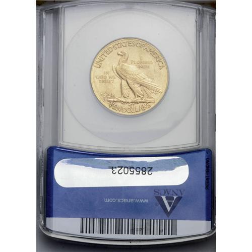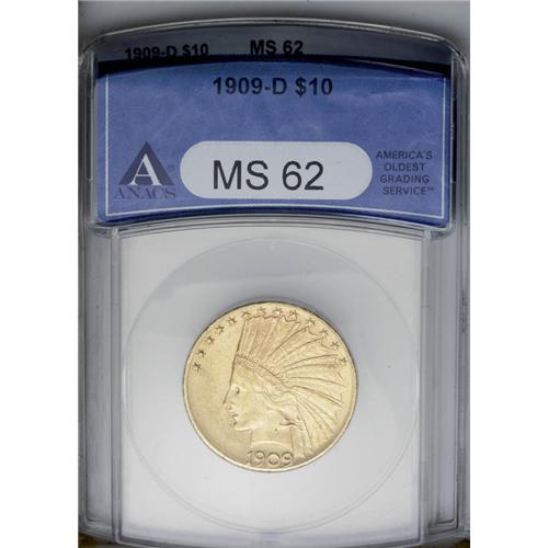 <B>1909-D<$10> MS62 ANACS.</B></I> Vibrant luster illuminates fine-grain surfaces that are alternately toned in green-gold and rose coloration. The central striking details are typically soft, and trivial surface marks are noted on both obverse and reverse. A pleasing example of this low-mintage issue.