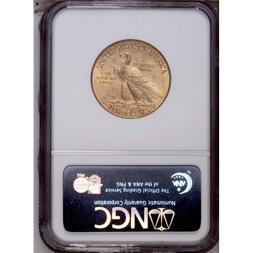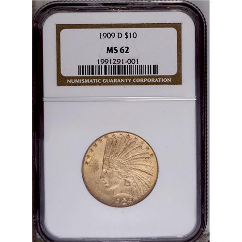 <B>1909-D<$10> MS62 NGC.</B></I> Fully lustrous tan-gold surfaces display a bright, matte-like texture and an adequate strike. Numerous contact marks overall serve to limit the grade.