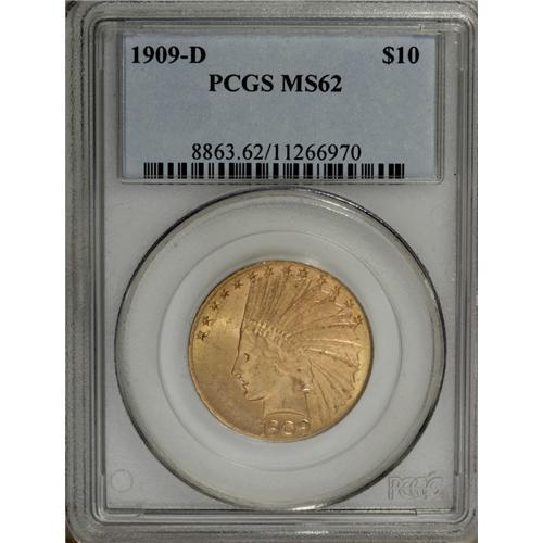 <B>1909-D $10 MS62 PCGS.</B></I> Well struck and satiny with a hint of orange at the rims. This lightly abraded piece has a yellow-gold cast otherwise. A pleasing representative from an often-elusive early Saint-Gaudens issue.<BR><BR><b>Shipping:</b> Coins & Currency (<a target="_blank" href="http://www.heritageauctions.com/common/shipping.php">view shipping information</a>)