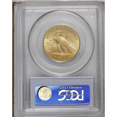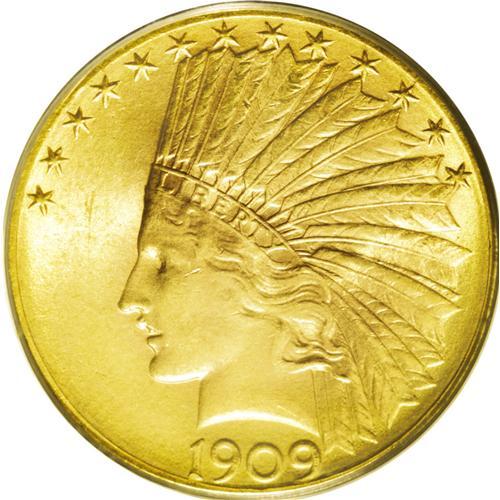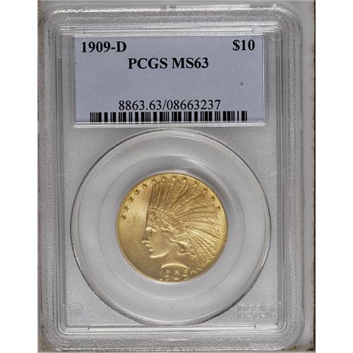 <B>1909-D<$10> MS63 PCGS.</B></I> Swaths of peach- and champagne-gold color cover this coin beneath a layer of attractive satiny luster. Surface markings, none of which is individually distracting, are consistent with the Select grade. Although lower grade pieces are readily available, the 1909-D Indian Eagle is scarce this nice, and the date becomes much harder to find and consequently much more expensive once it reaches Choice status.