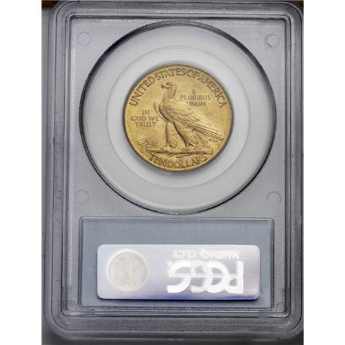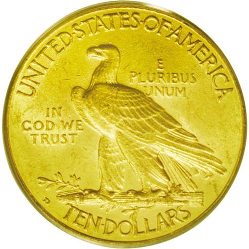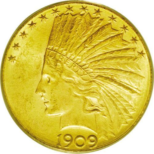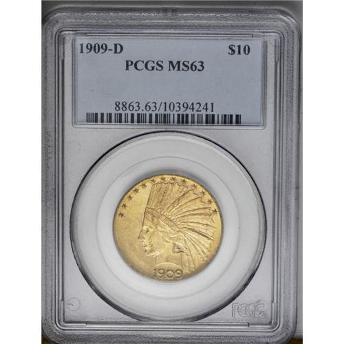 <B>1909-D<$10> MS63 PCGS.</B></I> The '09-D is one of the most elusive dates in the entire ten Indian series. Rarely is it seen in Mint State conditions, and many high grade pieces are now impounded in major collections. This piece shows the typical, pebbly surfaces that are often seen on this issue. Rich yellow-golden color enhances the lustrous appearance. A few marks and abrasions are seen, particularly in the reverse field, these being the grade-limiting factors. Population: 95 in 63, 38 finer (5/06).