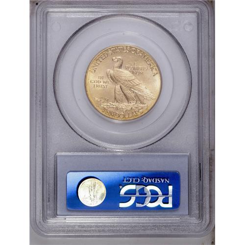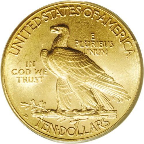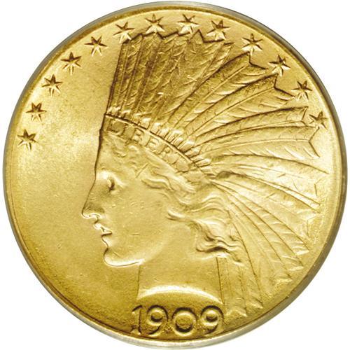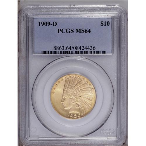 <B>1909-D<$10> MS64 PCGS.</B></I> An underrated Indian eagle despite a not overly generous production of 121,540 coins, the 1909-D is scarce to rare at all levels of Mint State preservation. When offered, the typical Uncirculated '09-D displays luster that is not quite as vibrant as that seen on many survivors of the 1908-D Motto issue. The present example is warmly frosted in finish with some granularity. The surfaces are significant because of the relative lack of distracting abrasions on both sides. There are no singularly mentionable blemishes, and the overall sharp strike is impressive for a branch mint Indian eagle. Population: 28 in 64, 10 finer (1/06).