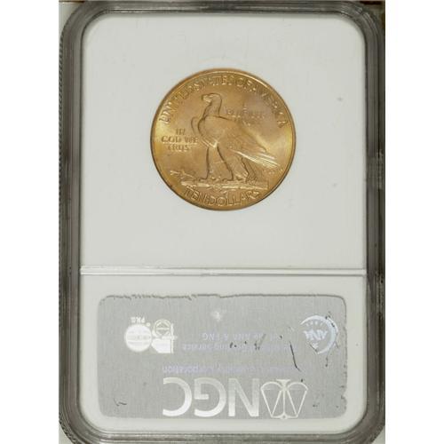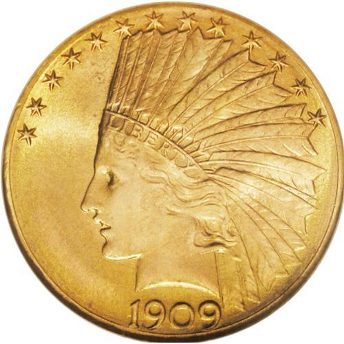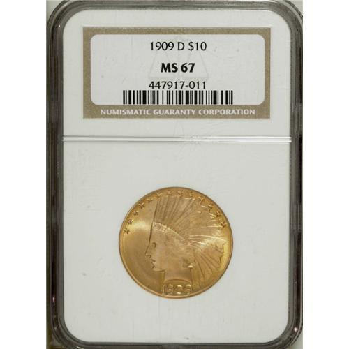 <B>1909-D $10 MS67 NGC.</B></I> When the Denver Mint started production in 1906, it, like the New Orleans Mint before it, began by striking silver and gold coinage. The fledgling Colorado establishment quickly proved its usefulness, and in conjunction with the resurgent "Granite Lady" in San Francisco, it demonstrated by comparison how outmoded the facility at New Orleans had become. In the year Denver minted this attractive ten dollar gold piece, one of 121,540 such examples, America's southernmost branch mint produced dimes through half dollars and half eagles only, and the New Orleans Mint never struck another coin before it was decommissioned in 1911.<BR> Although the spotlight is rarely on the 1909-D eagle when numismatists think of gold coins from that year, it is impossible to deny the remarkable condition rarity of this representative. It is the <I>only</B></I> Superb Gem of this issue graded by NGC, and PCGS has certified just two examples in this lofty grade (12/06). Interestingly, now Heritage can claim to have offered all three of them, the first at the FUN 1999 sale, and the second (which was pedigreed to the Price collection) at the Morse sale of November 2005. The present piece has vivid orange-gold surfaces and strong, slightly satiny luster. A trace of emerald graces the reverse fields. The strike is generally solid and trumps the norm for this issue, though, as always, a trace of softness affects the hair below the headband and the eagle's talons. The obverse is incredibly clean, and only a handful of tiny marks and grazes on the reverse preclude an even higher grade. Overall, the eye appeal is highly favorable, and this piece holds its own when compared side-by-side with photographs of the Price-Morse specimen. This lot offers a remarkable second chance for those who vied for that piece and a fleeting opportunity for all other interested collectors..<BR><BR><b>Shipping:</b> Coin/Currency (<a target="_blank" href="http://www.heritageauctions.com/common/shipping.php">view shipping information</a>)