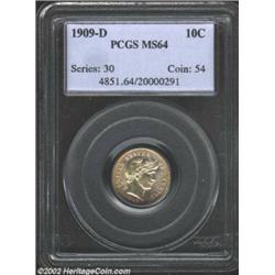 1909-D 10C MS64 PCGS. Lovely champagne tinged iridescence yields to brilliance in the center of the obverse and over much of the reverse. Both sides are boldly impressed, and the surface preservation is impressive for a survivor of this scarce, low mintage (954,000 pieces) Barber Dime. The luster is mostly frosty in texture.From the Ronald Bozarth Collection. Important notice: We expect to be auctioning lots at the rate of 200-250 per hour. Sometimes eBay Premier live bid software cannot keep up with that pace, so we strongly recommend that you place a realistic proxy bid now as insurance to avoid disappointment. Also please note that all Heritage/CAA lots purchased through eBay Premier carry a 20% Buyer's Premium. Please make sure you read the Terms and Conditions.