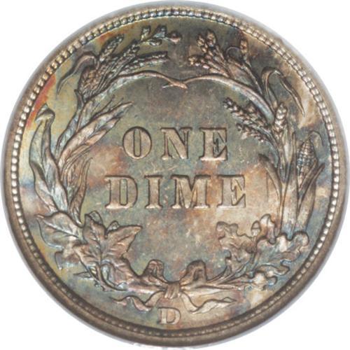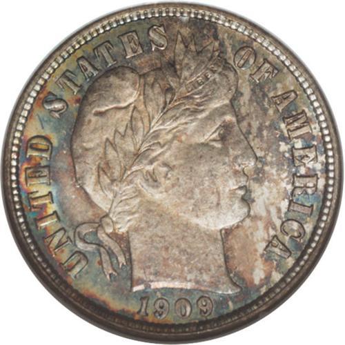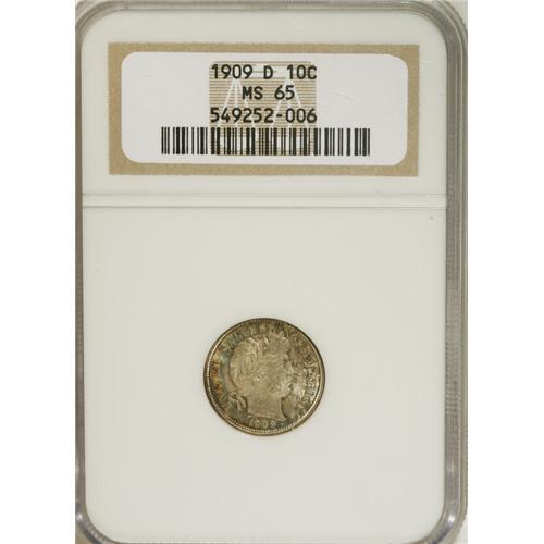 <B>1909-D 10C MS65 NGC.</B></I> From the early years of the Denver Mint comes this delightful dime, satiny beneath waves of aqua, emerald, and olive-gold patina. Surprisingly well-preserved for this issue of fewer than a million pieces and a condition rarity, as only a handful of individuals saved representatives. Census: 12 in 65, 2 finer (4/07).<BR><BR><b>Shipping:</b> Coins & Currency (<a target="_blank" href="http://www.heritageauctions.com/common/shipping.php">view shipping information</a>)