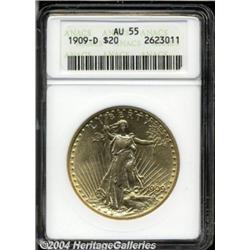 <B>1909-D<$20> AU55 ANACS.</B></I> The eagle's breast and Liberty's raised knee indicate brief circulation, but the cartwheel luster is essentially complete and the fields are not unduly marked. Just 52,500 pieces were produced.<BR><I>From The Dennis Gundy Collection.</B></I> <BR><BR><B>Important notice:</B> Heritage usually auctions material at the rate of 200-250 lots per hour. On some occasions eBay Live bid software or the Internet may not be able to keep up with the pace of the auction. We recommend placing a realistic absentee bid now as insurance to avoid disappointment. Occasionally the auctioneer may eliminate or reject an eBay Live bid, and the auctioneer may also reopen a lot after the close of the eBay live bidding (usually because we missed an audience bid), and may reject your bid even if it shows you as the winning bidder. By bidding via eBay Live, you agree that Heritage may award the lot to another bidder at its sole discretion under the circumstances described above or any other reasonable circumstances. Since eBay bids are not shown to us until we open the lot on the floor, we treat those bids just like floor bids. In most cases the floor responds before the eBay bid is presented to us, due to Internet lag time, so for consistency we have made it a policy that floor bids are always considered first over tie eBay live bids. Also please note that all Heritage lots purchased through eBay Live carry a 20% Buyer's Premium. Please make sure you read the Terms and Conditions before you bid. </span></font></tr></table></td></tr></table>