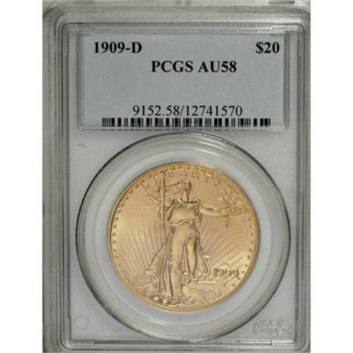 <B>1909-D $20 AU58 PCGS.</B></I> Warm sun-gold and yellow surfaces show strong luster despite a touch of friction on the central devices. Well struck with small, scattered marks and solid eye appeal.<BR><BR><B>Coin Engraver:</B> Augustus Saint-Gaudens<BR><BR><b>Shipping:</b> Coins & Currency (<a target="_blank" href="http://www.heritageauctions.com/common/shipping.php">view shipping information</a>)
