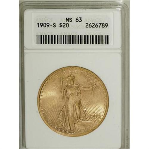 <B>1909-S $20 MS63 ANACS.</B></I> This bright S-mint displays pleasing luster on peach-gold surfaces that are lightly abraded. Excellent definition is noted on the design elements.<BR><BR><b>Shipping:</b> Coins & Currency (<a target="_blank" href="http://www.heritageauctions.com/common/shipping.php">view shipping information</a>)