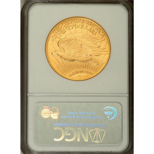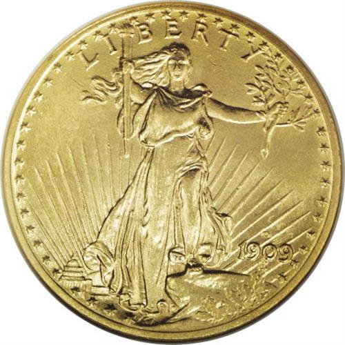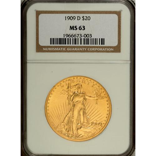 <B>1909-D $20 MS63 NGC.</B></I> A key date in the Saint-Gaudens series and the scarcest D-mint issue, the 1909-D had an original mintage of only 52,500 coins, and the typical example encountered--when they are encountered at all--grades only MS61 or so. The present example offers luscious yellow-gold coloration with satiny luster and enormous eye appeal. A couple of small luster grazes appear in the left obverse field upon careful scrutiny, but this coin nonetheless appears high-end for the assigned grade. Census: 44 in 63, 80 finer (12/06).<BR><BR><b>Shipping:</b> Coin/Currency (<a target="_blank" href="http://www.heritageauctions.com/common/shipping.php">view shipping information</a>)