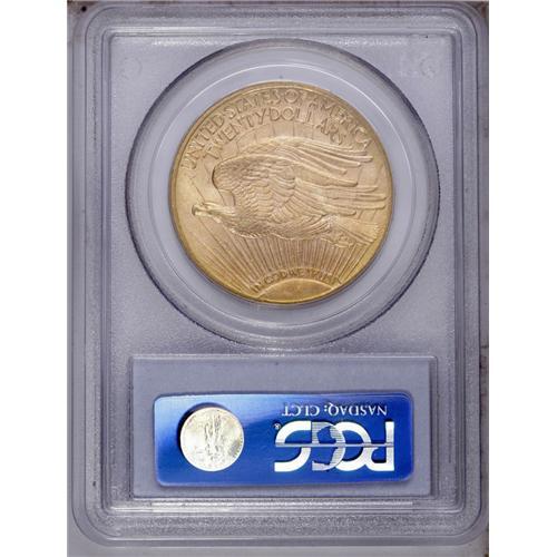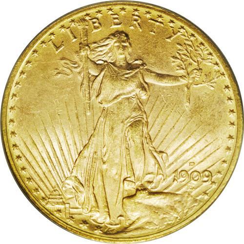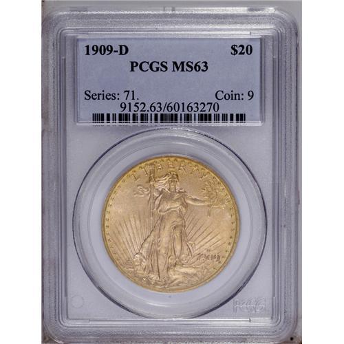 <B>1909-D<$20> MS63 PCGS.</B></I> The 1909-D has an impressively low mintage of only 52,500 pieces, second only to the 1908-S among early dates in the Saint-Gaudens series. The '09-D is always a welcome addition to any auction as it is genuinely scarce in all grades and avidly sought after by collectors. While not the highest obtainable grade for this difficult issue, this particular coin represents excellent value. It displays smooth, satiny mint luster with the usual fine-grain, matte-like texture. Sharply struck throughout, the surfaces show only the smallest abrasions, none of which merit individual mention.