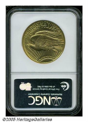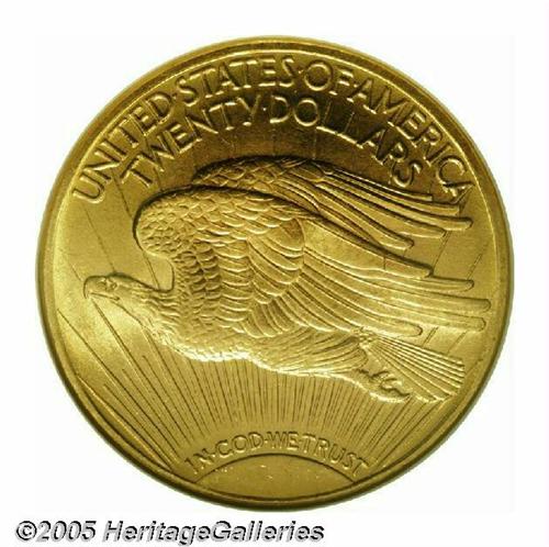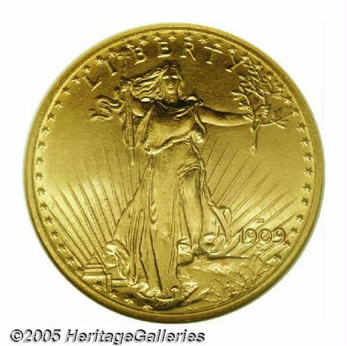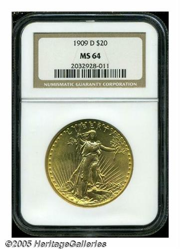 <B>1909-D<$20> MS64 NGC.</B></I> The 1909-D has an impressively low mintage of only 52,500 pieces, second only to the 1908-S among early dates in the Saint-Gaudens series. The '09-D is always a welcome addition to any auction as it is genuinely scarce in all grades and avidly sought after by collectors. While not the highest obtainable grade for this difficult issue, this particular coin represents excellent value. It displays smooth, satiny mint luster with the usual fine-grain, matte-like texture. Sharply struck throughout, the apricot-gold surfaces show only the smallest abrasions, none of which merit individual mention. Population: 64 in 64, 4 finer (5/05).<BR><I>From The Clifford Columbus Collection.</B></I>
