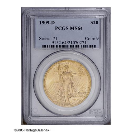 <B>1909-D<$20> MS64 PCGS.</B></I> A second near-Gem example of this scarce and underrated early Saint. The surfaces display the usual satiny mint luster and light patina. Sharply defined throughout and minimally abraded. An unusual opportunity for the advanced collector in the Saint-Gaudens series.