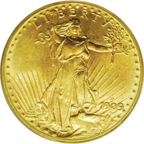 <B>1909-D<$20> MS64 PCGS.</B></I> In its second year of production for the Saint-Gaudens double eagle, the Denver Mint delivered only 52,500 coins. This date was once regarded as a major rarity in Mint State, but the emergence of a Central American hoard in 1983 has made the '09-D generally available in grades up to and including the MS63 level. In Choice Mint State and finer grades, however, this issue remains elusive. Softly frosted with pleasing cartwheel effects, the surfaces are tinged in reddish-gold hues. Both sides are well produced with sharp definition and freedom from all but a few, mostly small abrasions. PCGS has seen just 18 coins finer than MS64 (4/06).