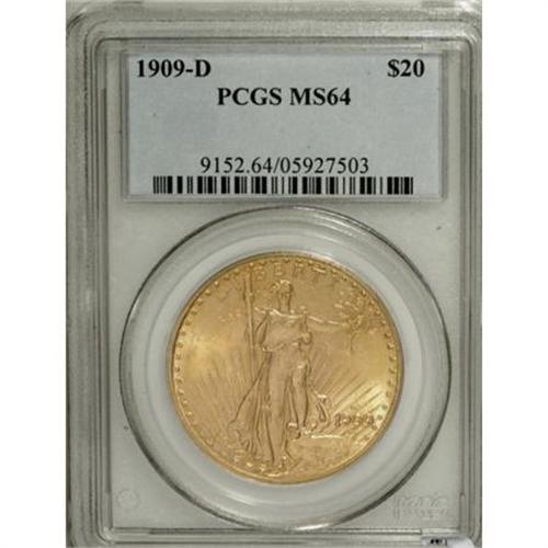 <B>1909-D $20 MS64 PCGS.</B></I> This is a highly lustrous near-Gem specimen with brilliant orange-gold color and frosty surfaces. Both sides are well-detailed. The primary obverse design motif has slightly lighter pink color. A few faint abrasions can be seen on each side, but none are immediately obvious.<BR> The 1909-D double eagle is quite scarce. The mintage was limited to 52,500 coins, and many of those actually entered circulation. Few high quality survivors have been identified. In fact, PCGS has only certified 26 finer quality pieces (6/07) since it began grading coins some 20 years ago.<BR><BR><b>Shipping:</b> Coins & Currency (<a target="_blank" href="http://www.heritageauctions.com/common/shipping.php">view shipping information</a>)