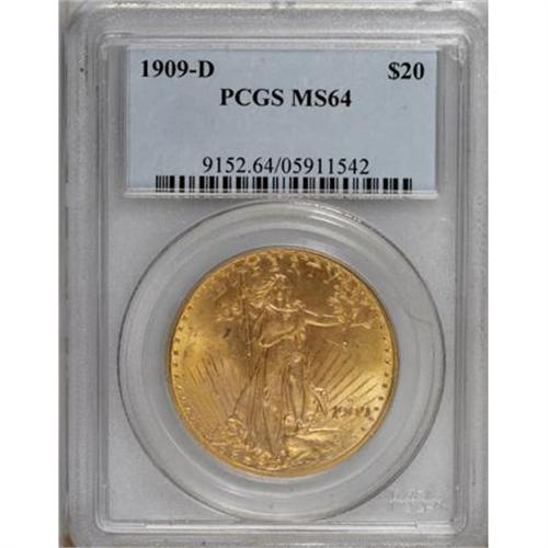 <B>1909-D $20 MS64 PCGS.</B></I> For at least 20 years the 1909-D has been an overlooked issue among early Saints. In an interview with a local paper in 1978, Steve Ivy listed the 1909-D as a coin to buy for long-term investment. It still remains a good buy today when one considers the availability and price of other dates and mintmarks in the series. Only one hoard of any note has been discovered and distributed over the past 30 years, that of several hundred pieces and found in 1983, most of which graded MS63 or less. <BR> This is a remarkably clean coin whose satiny mint luster shows a lovely interplay of pale rose and lilac patina. Fully struck throughout.<BR><BR><B>Coin Engraver:</B> Augustus Saint-Gaudens<BR><BR><b>Shipping:</b> Coins & Currency (<a target="_blank" href="http://www.heritageauctions.com/common/shipping.php">view shipping information</a>)