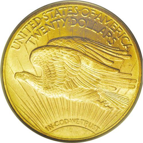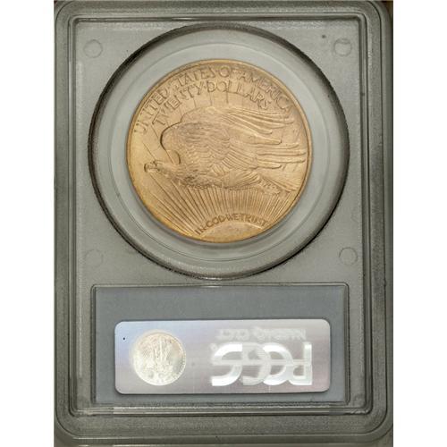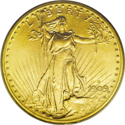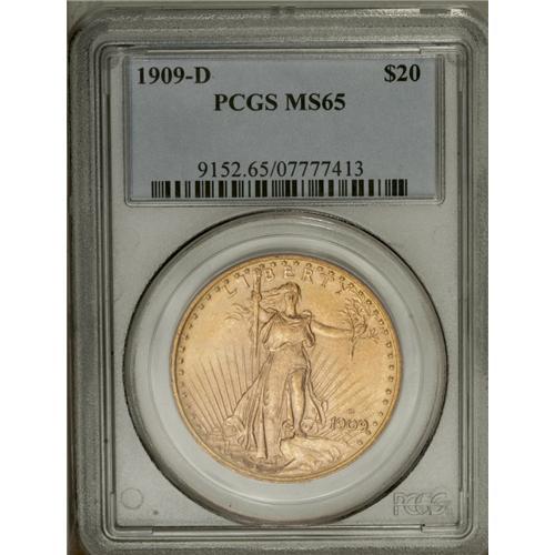<B>1909-D<$20> MS65 PCGS.</B></I> Repunched Mintmark. The mintage of this issue was just 52,500 coins, one of the lowest in the entire Saint-Gaudens series, although mintage figures, and especially low mintage figures, are not an immediate indication of rarity. Only three issues had lower figures, but about 15 dates are valued at higher levels. Only five finer examples of this date have been certified by PCGS, an indication of just how difficult it is to find a Gem quality example of this date. Regarding Gems, Dave Bowers commented: "Gems are especially rare, and when they come on the market excitement prevails!" Unlike many other issues, it seems that most examples of this date remained Stateside, as few have been found in overseas banks or other locations.<BR> This repunched mintmark variety was first identified by Dave Bowers and recorded in the Norweb Collection catalog, Part III, described as a Large over Small Mintmark. Microscopic examination of the Gem now offered reveals that this is actually a tripled mintmark. This is a lovely Gem specimen with satiny orange-gold color and brilliant luster. Hints of olive near the borders adds eye appeal to this sharply struck example. It is a sharply struck example with few abrasions. Population: 13 in 65, 5 finer (7/06).