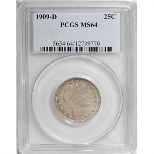 <B>1909-D 25C MS64 PCGS.</B></I> A well struck D-mint quarter that offers soft, shimmering luster beneath rich gold, violet, and silver-gray patina. Pleasingly preserved for an issue seldom offered any finer. Population: 56 in 64, 42 finer (3/08).<BR><BR><B>Coin Engraver:</B> Charles E. Barber<BR><BR><b>Shipping:</b> Coins & Currency (<a target="_blank" href="http://www.heritageauctions.com/common/shipping.php">view shipping information</a>)