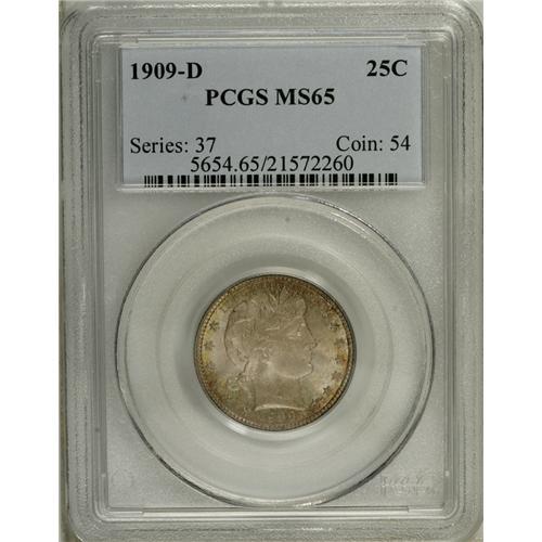 <B>1909-D 25C MS65 PCGS.</B></I> Both sides are draped in medium gray toning that yields to flashes of attractive reddish-orange color at the borders. Very well struck save for a couple of incomplete stars on the right side of the obverse. While struck in comparatively large numbers, very few Gem or better examples survive of this fourth year Denver issue. Population: 21 in 65, 16 finer (11/06).<BR><BR><b>Shipping:</b> Coin/Currency (<a target="_blank" href="http://www.heritageauctions.com/common/shipping.php">view shipping information</a>)