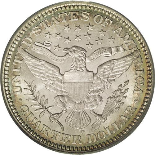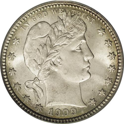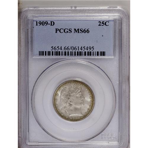 <B>1909-D<25C> MS66 PCGS.</B></I> The condition scarcity status of this Premium Gem is attested to by the certified population data, that show slightly more than 20 examples graded by PCGS and NGC in this level of preservation, and fewer than five finer. A narrow band of light olive-green encircles the perimeters of each side, joined by wisps of cobalt-blue and gold-tan at the reverse margin. Sharply struck throughout, and just a few minor scuffs show in the right obverse field. Population: 17 in 66, 3 finer (6/06).