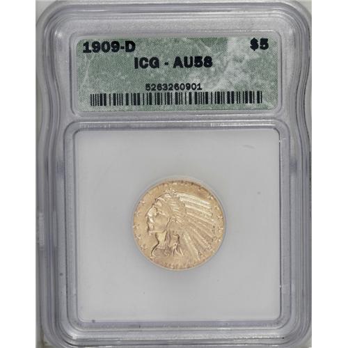 1909-D $5 AU58 ICG. NGC Census: (1596/17778). PCGS Pop