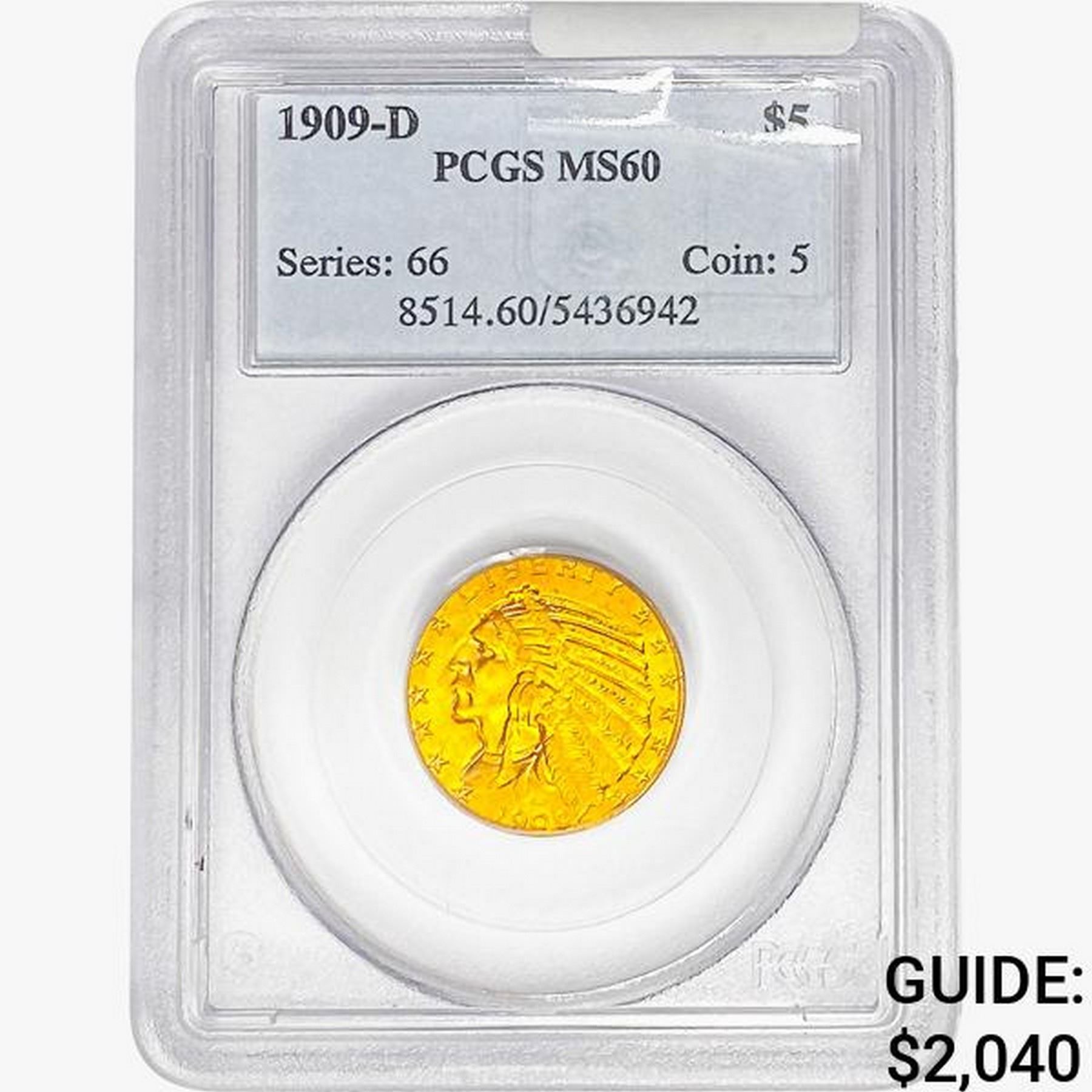 1909-D $5 Gold Half Eagle PCGS MS60