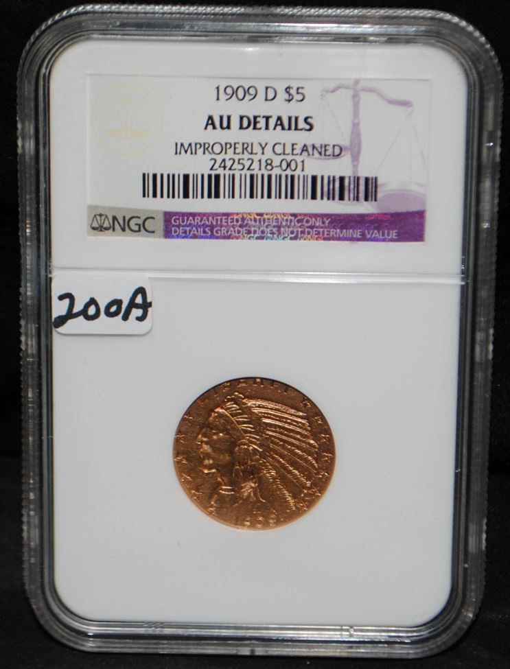 1909-S $5 INDIAN GOLD COIN - NGC AU DETAILS (IMPROPERLY CLEANED) - THECURRENT COIN WORLD TRENDS LISTS AN AU50 @ $500.00 AND AN AU58 @ $575.00
