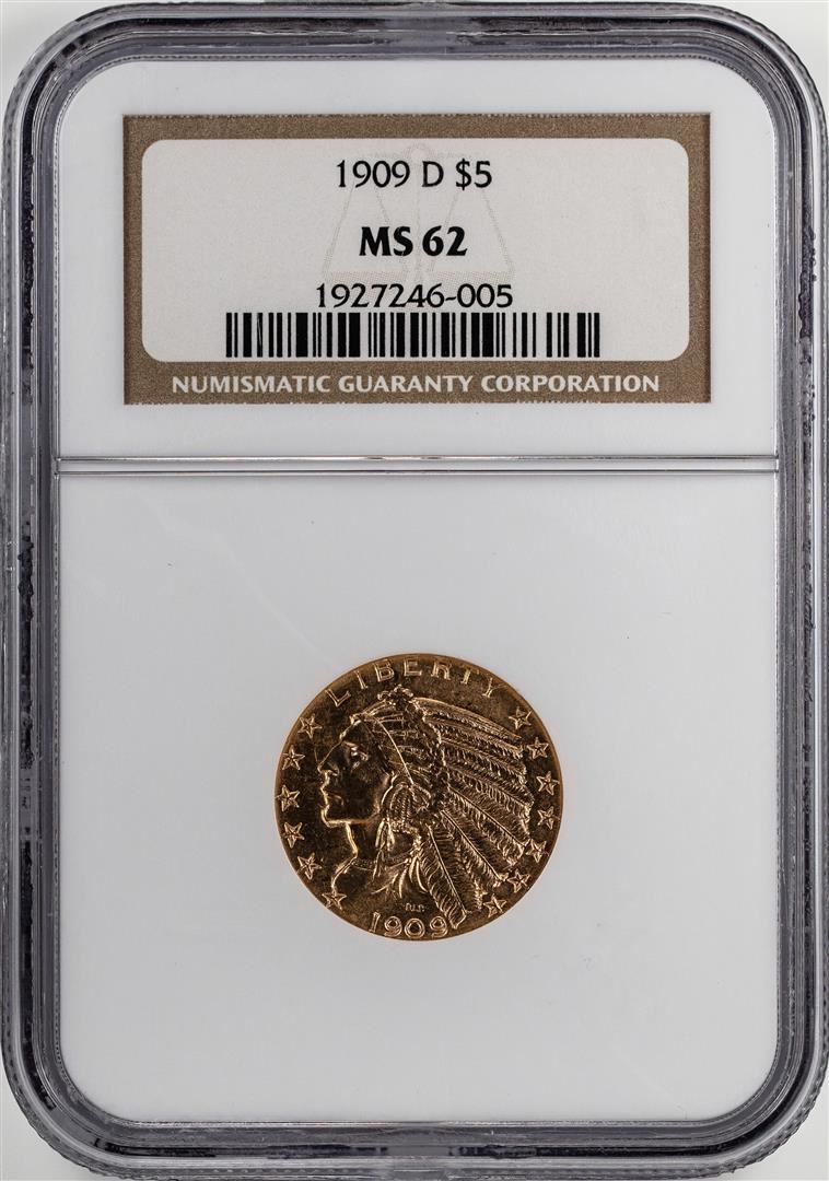 One 1909-D $5 Indian Half Eagle Gold Coin NGC MS62. NGC Certified.