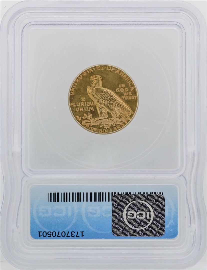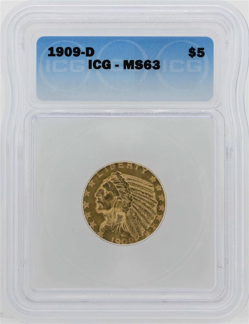 One 1909-D $5 Indian Head Half Eagle Gold Coin ICG MS63. ICG Certified.