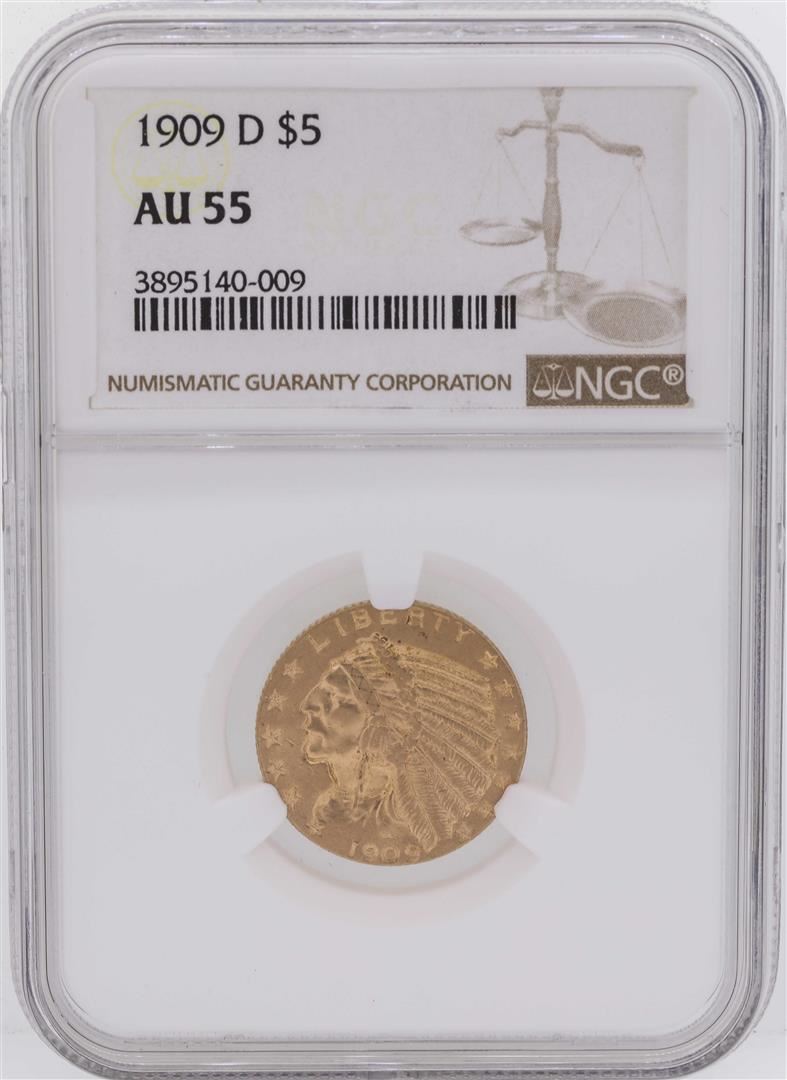 One 1909-D $5 Indian Head Half Eagle Gold Coin NGC AU55. NGC Certified.