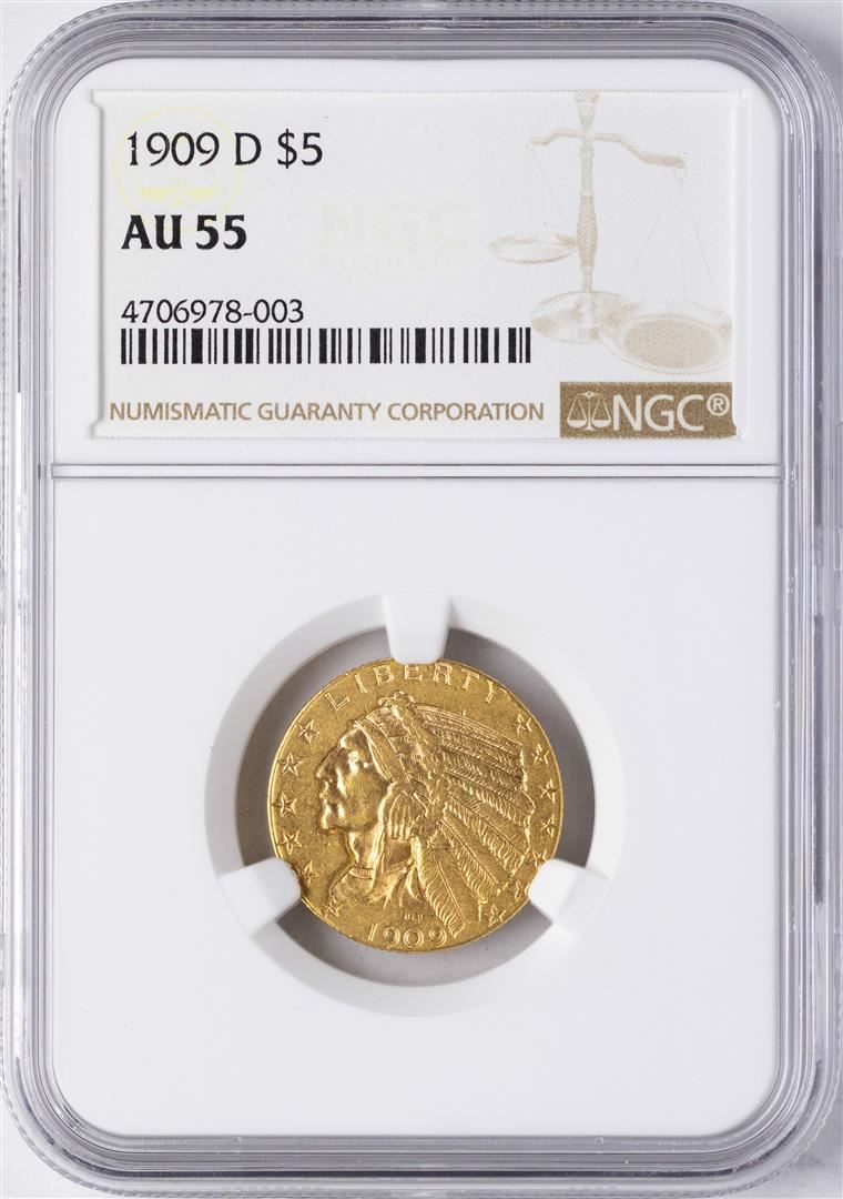 One 1909-D $5 Indian Head Half Eagle Gold Coin NGC AU55. NGC Certified.