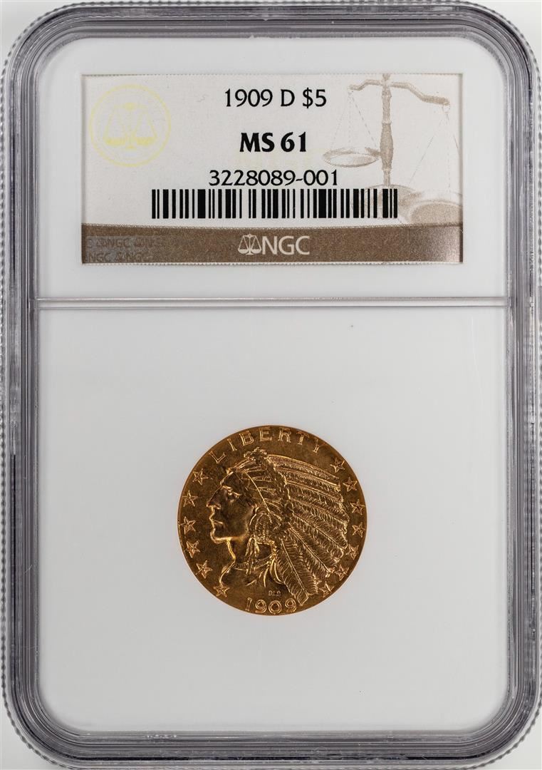One 1909-D $5 Indian Head Half Eagle Gold Coin NGC MS61. NGC Certified.