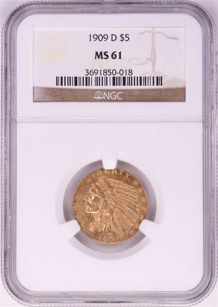 One 1909-D $5 Indian Head Half Eagle Gold Coin NGC MS61. NGC Certified.