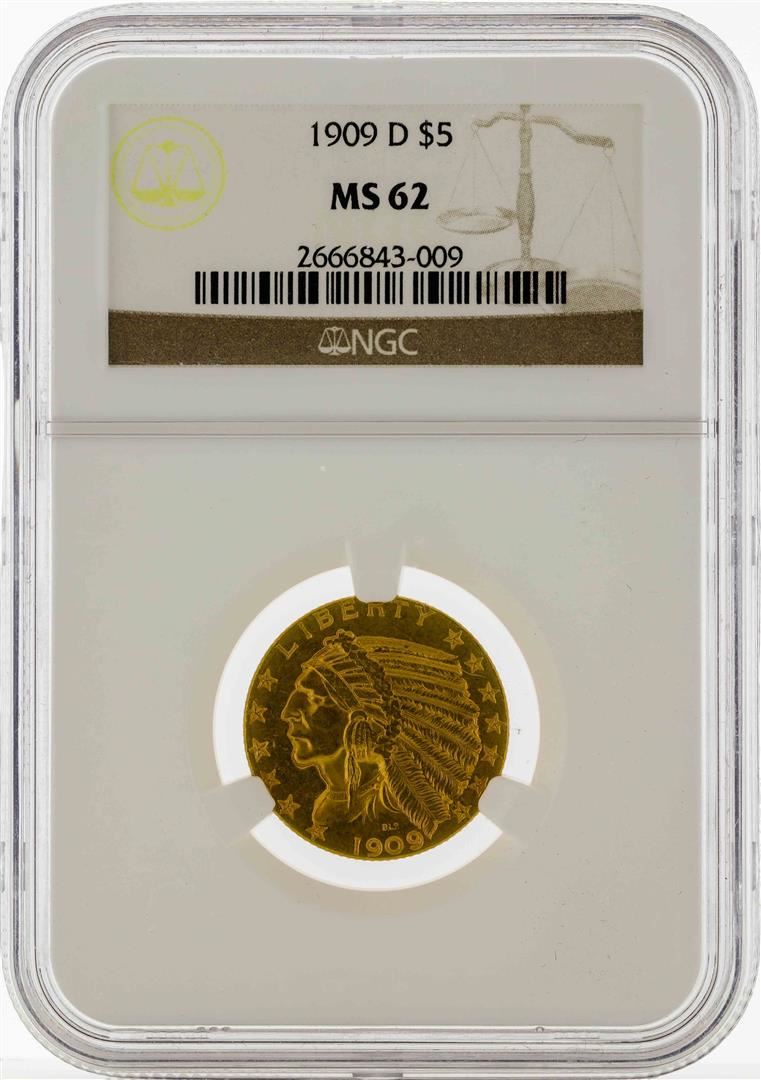 One 1909-D $5 Indian Head Half Eagle Gold Coin NGC MS62. NGC Certified.