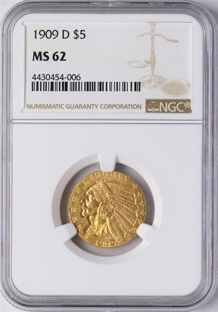 One 1909-D $5 Indian Head Half Eagle Gold Coin NGC MS62. NGC Certified.