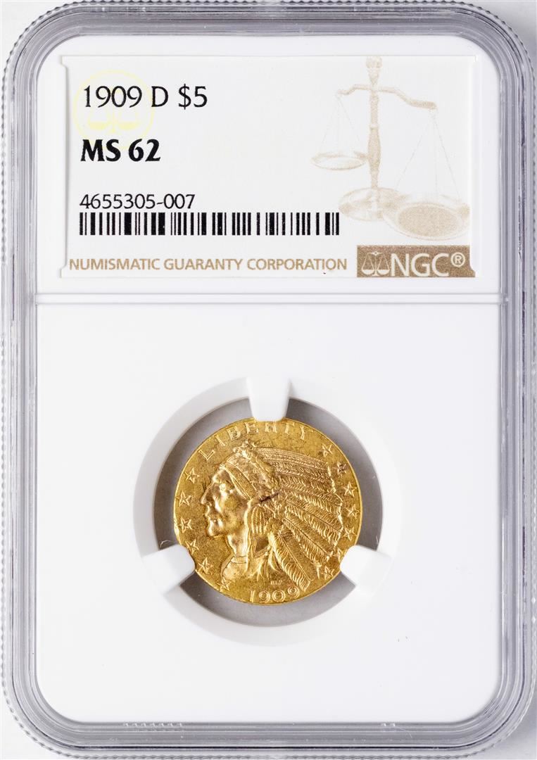 One 1909-D $5 Indian Head Half Eagle Gold Coin NGC MS62. NGC Certified.