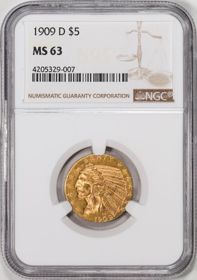 One 1909-D $5 Indian Head Half Eagle Gold Coin NGC MS63. NGC Certified.