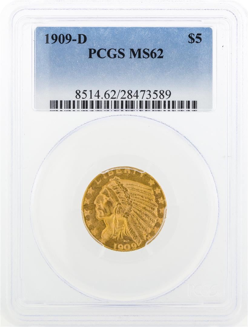 One 1909-D $5 Indian Head Half Eagle Gold Coin PCGS MS62. PCGS Graded.