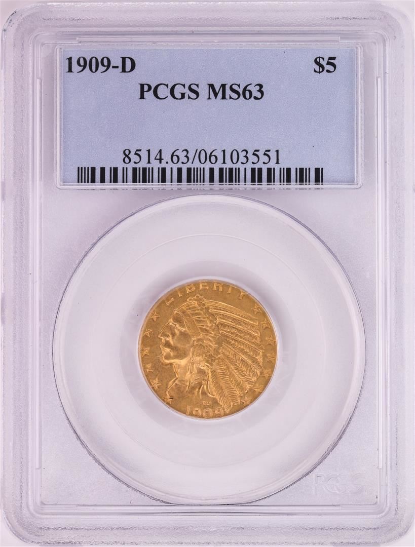 One 1909-D $5 Indian Head Half Eagle Gold Coin PCGS MS63. PCGS Graded.